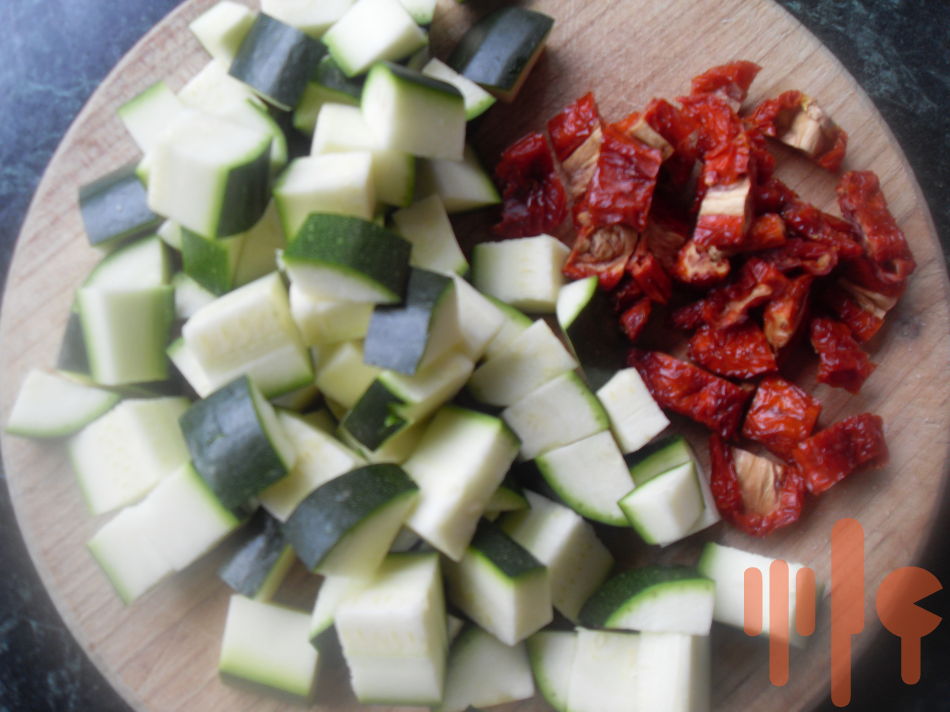 Na oleji speníte na drobno nakrájanú cibuľku, pridáte ryžu a pár minút opražíte. Podlejte ryžu bielym suchým vínom a nechajte ho odpariť. Osoľte a ďalej podlievajte vodou / ja dávam teplú/ v malých množstvách a priebežne miešajte, vždy po odparení tekutiny doplňte ďalšiu a neprestávajte miešať. Keď je ryža polomäkká pridáte k nej na kúsky nakrájanú cuketu a aj sušené paradajky. Ďalej podlievajte a miešajte. Zmes musí byť krémovitej konzistencie. Na záver vmiešajte strúhaný kvalitný parmezán.