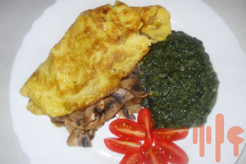 Špenát / mrazený listový, alebo čerstvý/ pripravte podľa receptu. Na cibuľke a troške oleja restujte huby, trošku bylinkovej soli, rasce....podľa chuti Na dobrej panvici urobte omeletu z jedného vajíčka, naplňte ju hubami. Servírujte spolu so špenátom.