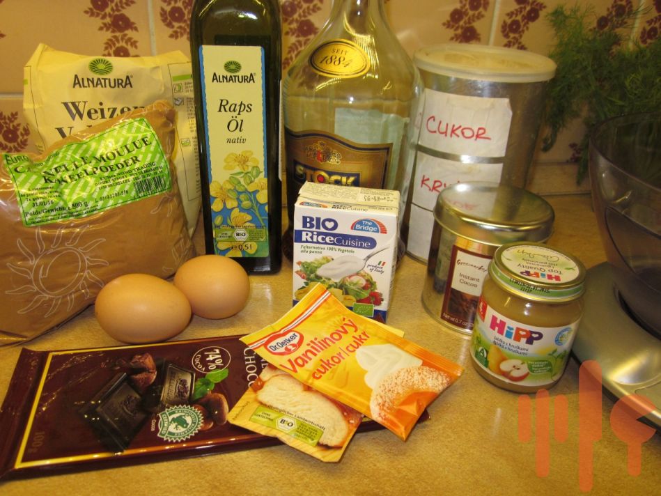 Čokoládu a olejrozpustíme vo vodnom kúpeli. Necháme vychladnúť a spolu s cukrom a vanilínovým cukrom a bio jablkovou dreňou šľaháme tak dlho, kým nevznikne hladký krém. (ak ste príliš lenivý, alebo sa ponáhľate ... dá sa aj bez úplného hladka) Vmiešame vajcia, smotanu, koňak a koreniny.