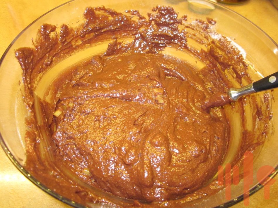 Do múčnej zmesi vmiešame krém z čokolády a vajec tak, aby sa všetko dostatočne spojilo, ale nebolo vymiešané dohladka.