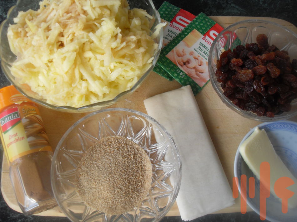 Strúhanku opražte na sucho na panvici a nechajte vychladiť. Ošúpané jablká nastrúhajte nahrubo a vytlačte z nich šťavu / vypiť..nevyliať :-)/ pripravte si rozpustené maslo s mliekom, vanilkový cukor, hrozienka a škoricu.