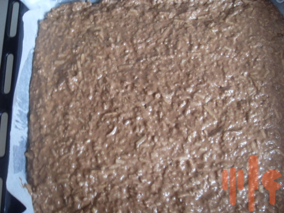 Jabĺčka ošúpeme a postrúhame na hrubo. Vajcia vyšľaháme s cukrom do peny. Múku zmiešame s práškom do pečiva /1ks/, kakaom, štipkou soli a škoricou. Túto zmes zamiešame do vyšľahaných vajec s cukrom. Dobre premiešame. Nakoniec vmiešame strúhané jablká. Podľa chuti možno pridať oriešky, mandle, alebo hrozienka. Dopočítať do kalorickej hodnoty koláčika. Chutí aj bez pridania kakaa.