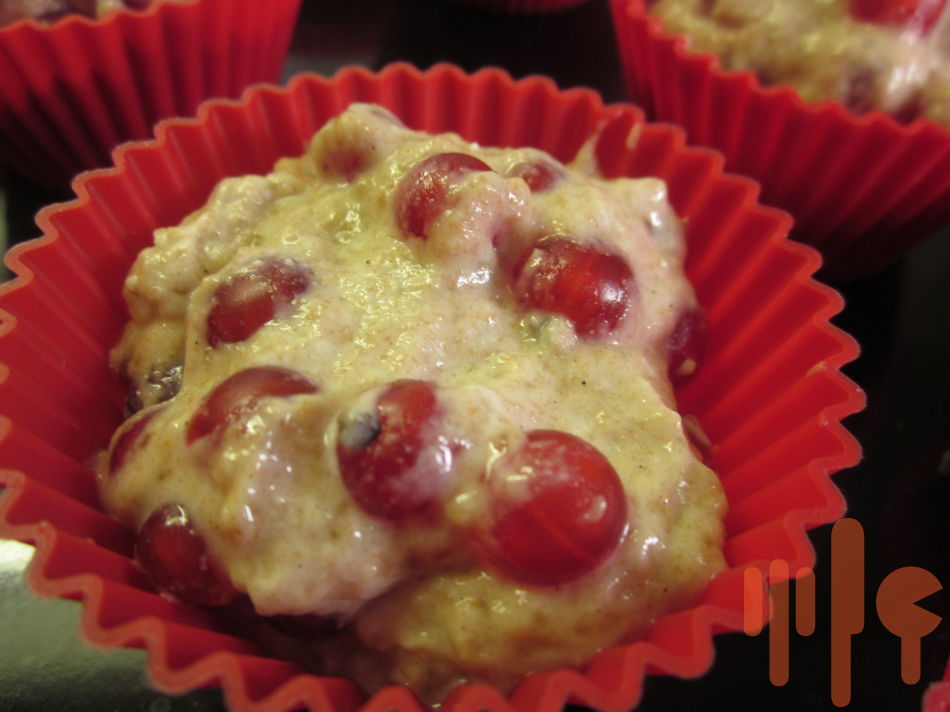 Do tejto zmesi vmiešajte suchú zmes, dobre premiešajte a opatrne vmiešajte umyté odkvapkané ovocie. Naplňte mufinové formičky a pečte pri teplote 180C cca 30 minút.