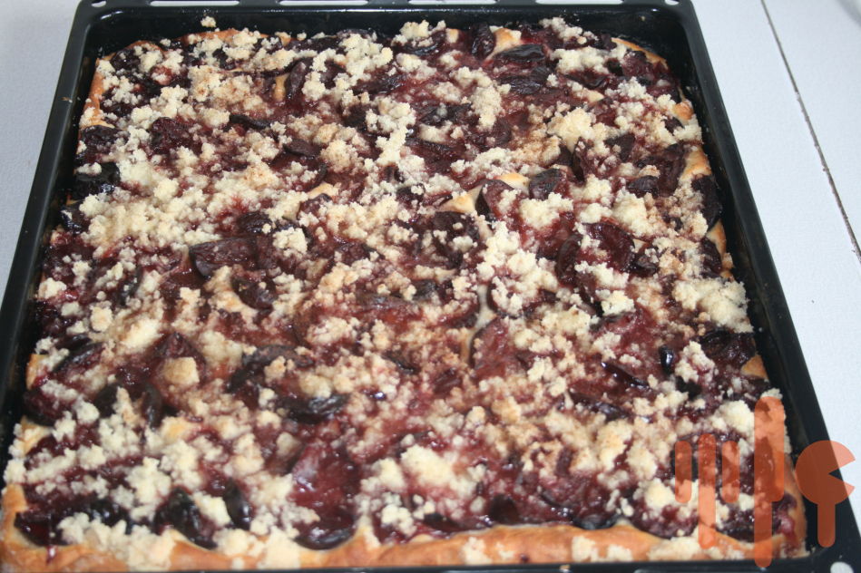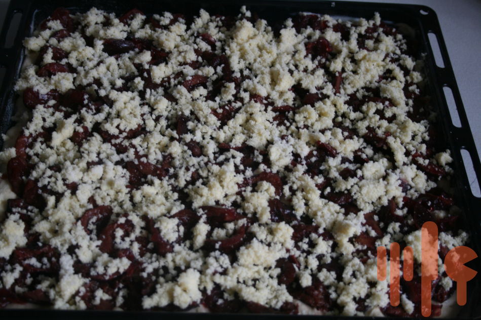 Cesto vyvaľkáme na papierom vyložený plech, pokladieme husto slivkami/ môže byť aj iné ovocie/posypeme posekanými orechami a škoricou.