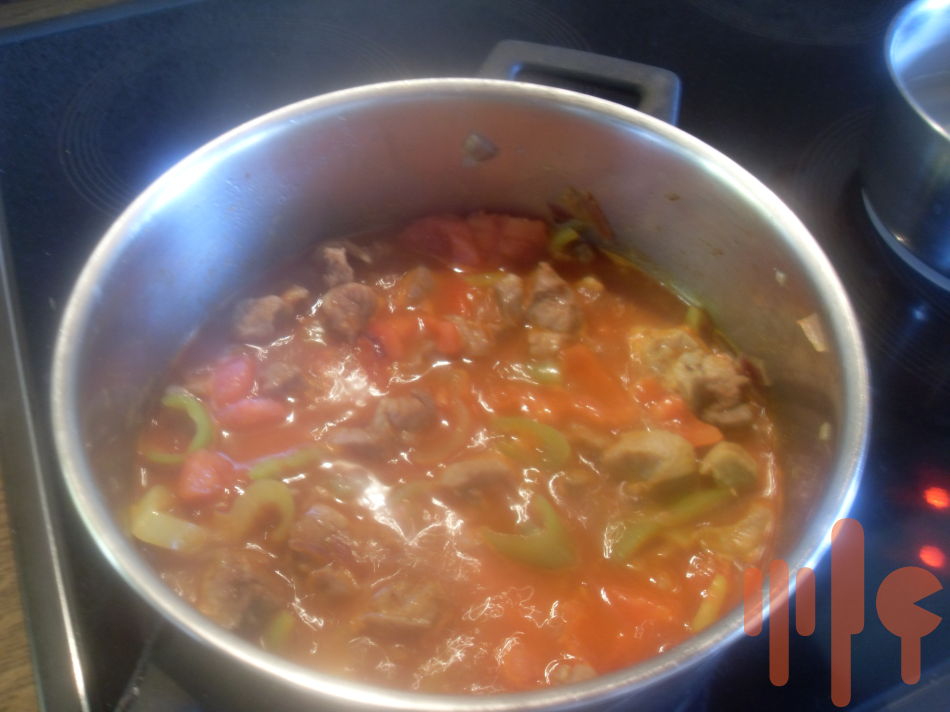 Do hrnca dáme lej, orestujeme cibuľu, pridáme nakrájané mäso a prudko opečieme. Zníime teplotu, pridáme mletú červenú papriku, premiešame a podlejeme vodou. Pridáme zeleninu, osolíme a dusíme do mäkka. Na záver ochutíme podľa zvyklostí...majorán, čierne korenie...prípadne feferónka.
