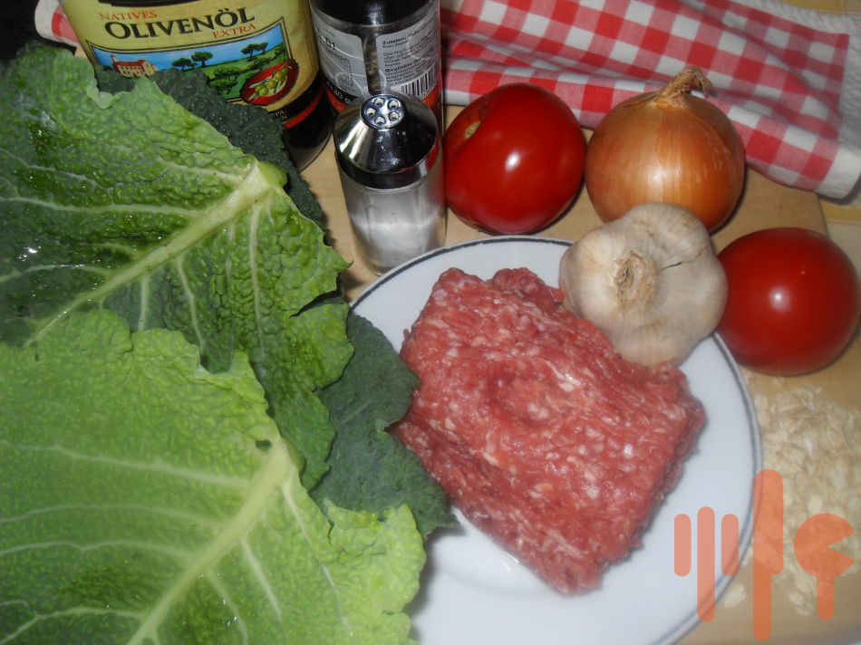 Kel rozoberiem na listy, tak aby sme mali na 4 porcie a dáme ich do vriacej osolenej vody na cca 10 minút povariť, pritom si môžete spariť aj paradajky a ošúpať ich. Záleží od hrúbky listov, nemali by veľmi zmäknúť, lebo sa rozpadnú. Ovsené vločky zaparte horúcou vodou. Medzitým si pripravíme plnku z mletého mäsa, do ktorého sme zamiešali namočené ovsené vločky, vajce, soľ, korenie a trochu oregana. Kelové listy vyberte z vody, vyrežte opatrne hlúbiky a rozprestrite na dosku. Na každý list položte do stredu mäsovú plnku a zaviňte, ak je treba pomôžte si obrúčkami na závitky,alebo niťou.