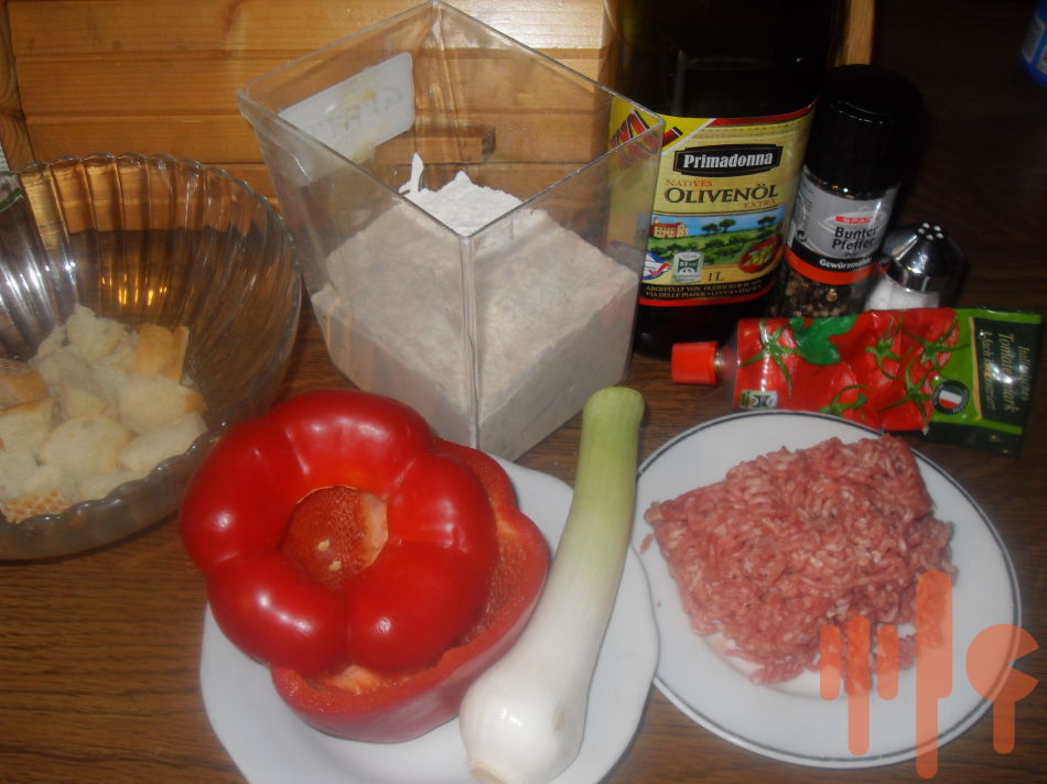 Príprava náplne: biely rožok pokrájame na kúsky a namočíme vo vode, mleté mäso, vajce, soľ, korenie, cibuľku,
