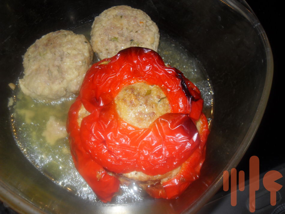 Do pekáčika nalejte trošku vody / alebo domáceho vývaru/ vložte tam papriku a guľky, prikryte a dajte do vyhriatej rúry