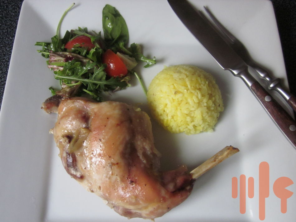 Zadn zajačie stehná prešpikujte slaninou, osoľle, vložte do pekáčika a pridajte nakrájanú šalotku a cesnak. Podlejte trochou vody. Pekáčik vložte do rozohriatej rúry a pečte do mäkka za občasného podlievania vlastným výpekom.