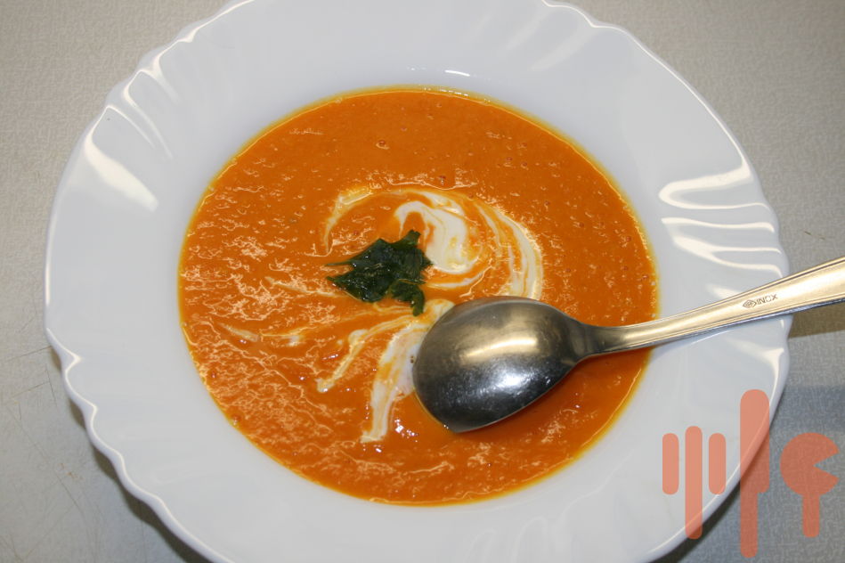 Na oleji speníme cibuľku a najemno nasekaný čerstvý zázvor, na kolieska pokrájanú mrkvu, torchu opražíme, pridáme pokrájanú tekvicu / najlepšia je Hokaido alebo muškátová/ a zemiaky. Podlejeme zeleninovým vývarom z jednej kocky a dusíme do mäkka. Rozmixujeme, osolíme a dolejeme vodu, aby vznikla krémová konzistencia. V tanieri pridáme do polievky lyžičku kyslej smotany a pažítku.