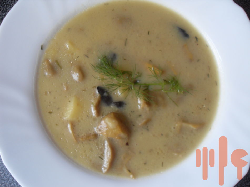 Hríby očistíme a pokrájame na väčšie kúsky. Olúpané zemiaky pokrájame na kocky. Očistíme a na drobno pokrájame cibuľku a na oleji ju restujeme spolu s bobkovým listom a novým korení. Pridáme hríby a zemiaky, osolíme a podlejeme vodou. Dusíme do mäkka. Na zahustenie polievky stačí zemiaky popučiť, alebo krátko zmixovať ponorným mixérom. Nakoniec pridáme smotanu - sójovú náhradu / dá sa aj mliečna smotana použiť/ a nasekanú petržlenovú vňať. Na ochutenie môžeme použiť aj iné bylinky...kôpor, pažítku...