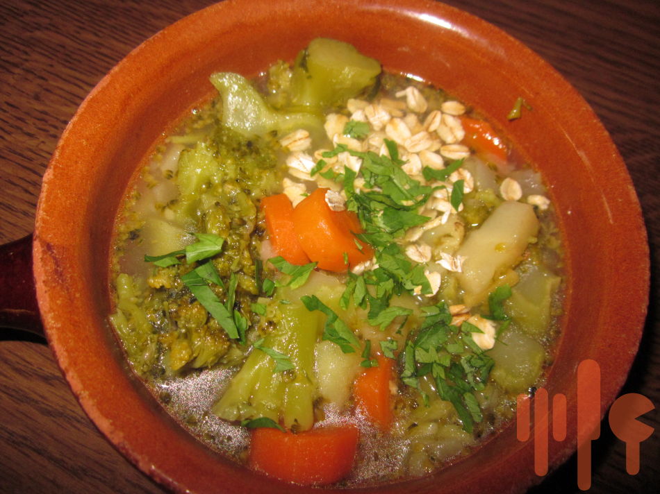 Pripravíme si zeleninu. Cibuľu spolu so zázvorom restujeme na oleji, pridáme na kolieska nakrájanú mrkvu, restujeme. Pridáme nakrájaný zeler a brokolicu, podlejeme vodou a osolíme. Varíme do polomäkka. Pridáme ovsené vločky...doplníme podľa potreby vodu, pár minút prevaríme a ochutíme.