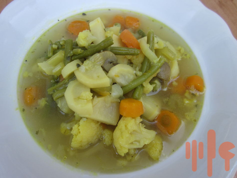 Zeleninu očistite a nakrájajte na kúsky. Na oleji restujte cibuľu, cesnak a zázvor, pridajte trochu kurkumy a nakrájanú mrkvu. Restujte a pridajte petržlen, stonkový zeler, karfiol, fazuľové struky a šampiňóny. Dolejte vodu, osoľte a varte do mäkka. Na dochutenie použite bylinky podľa zvyklostí... majorán, tymián, petržlenovú vňať.....