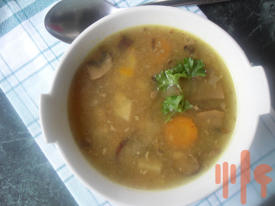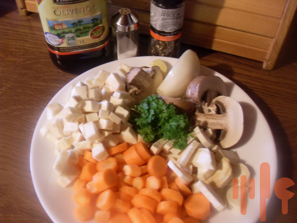 Zeleninu očistíte a pokrájate na kúsky, rovnako aj šampiňóny...použila som hnedé...majú lepšiu chuť a arómu. Na rozohriatom oleji orestujte cibuľu spolu so zázvorom, pridajte nakrájanú zeleninu a hríby a spolu restujte pár minút. Pridajte soľ, bylinky podľa chuti ( borievka, petržlenová vňať, ochutné soli.../ podlejte vodou a duste do polomäkka cca 10 minút. Dolejte potrebné množstvo vody, dochuťte a podávajte s petržlenovou aťou.