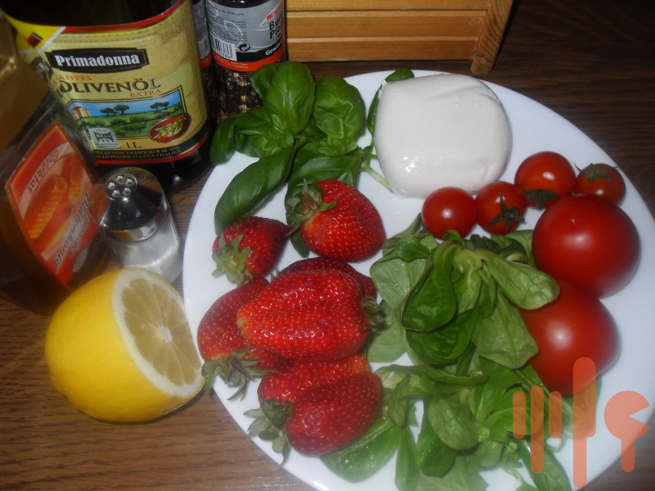 Zálievka: 200g jahôd nakrájajte na kúsky, pridajte citrónovú šťavu, javorový sirup / resp. med/ a rozmixujte ponorným mixérom. Dobre posoľte a okoreňte mletým čiernym korením.