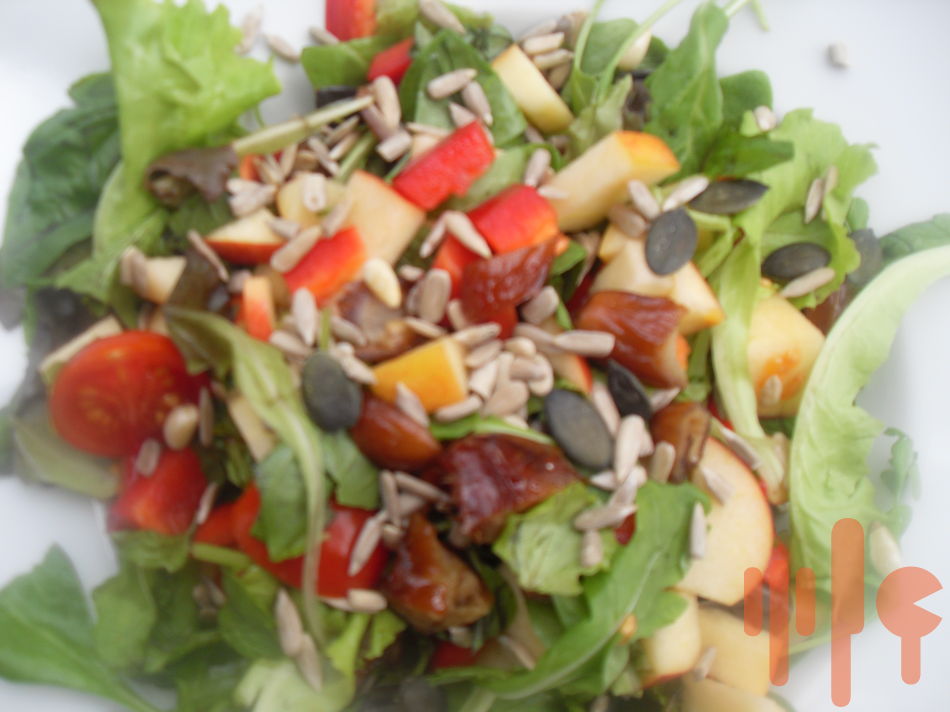 Dresing: zmiešajte balsamico ocot, horčicu, korenie, soľ, med a olej / použite shaker/. Dp tohto dresingu nakrájajte sušené ďatle bez kôstky a dajte na bok.
