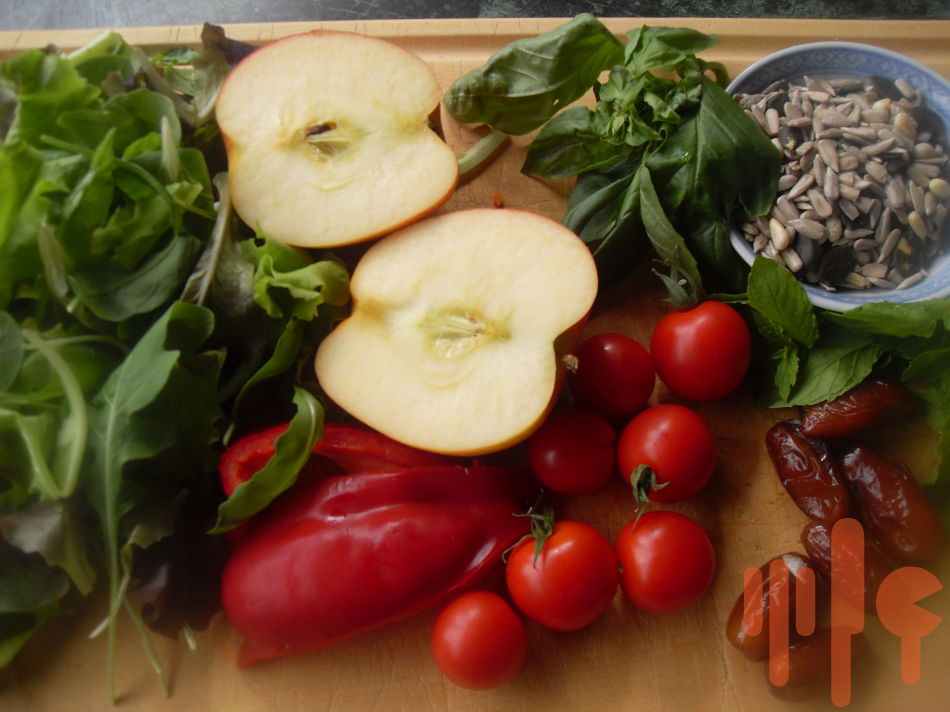Zmes listových šalátov dajte do misy, pridajte nakrájané cherry paradajky, červenú papriku, jablko nakrájané na kocky, lístky bazalky a mäty natrhajte ...jemne premiešajte, zalejte dresingom a posypané zrniečkami podávajte.