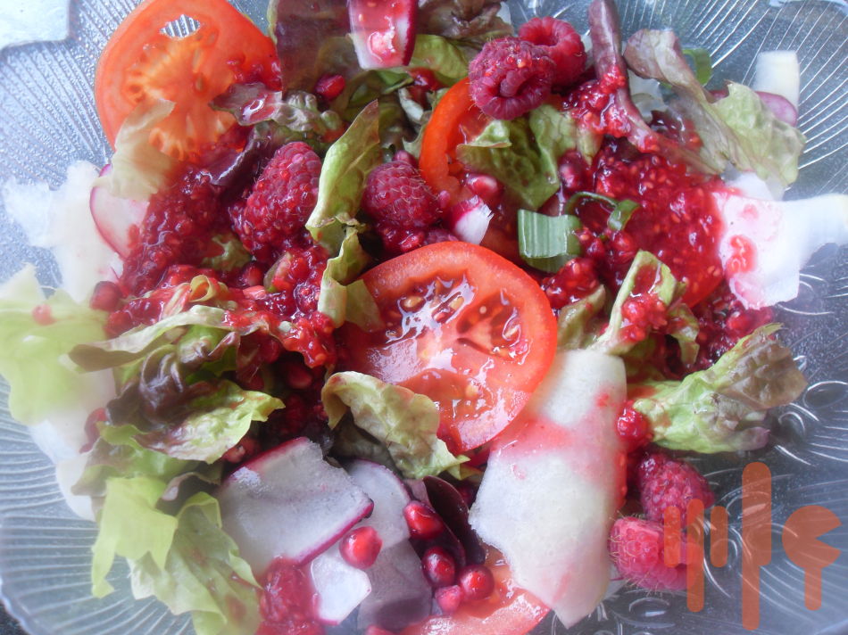 Dubový šalát očistite a natrhajte na väčšie kúsky, jarnú cibuľku spolu s vňatou nakrájajte na väčie kúsky, paradajky nakrájajte na tenké plátky, papriku nakrájajte na tenké pásiky. Reďkovky a mladý kaleráb nakrájajte škrabkou na zeleninu na tenké plátky. Všetku zeleninu opatrne premiešajte v mise, pridajte zrnká z granátového jablka a zachytenú šťavu a ozdobte zvyšnými malinami. Nakoniec pridajte vychladený dresing. Premiešajte a podávajte.