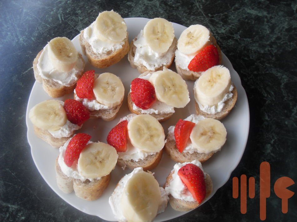 Grahamový rožok nakrájajate na kolieska, natrite odtučneným jemným tvarohom a pridajte nakrájaný banán, jahody...ovocie podľa sezóny.