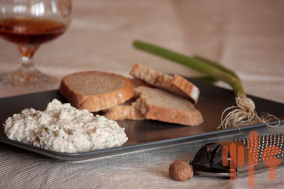 Do vyšľahaného jemného tvarohu pridajte nastrúhané orechy, nakrájaný kôpor, sol, postrúhaný muškátový oriešok a koňak,strúhaný parmesán a na záver vmiešajte nasekanú jarnú cibuľku.
