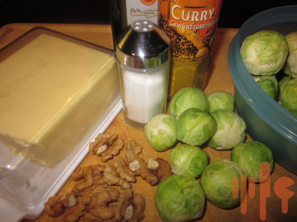 Ružičky kelu očistite z vrchných lístkov. Vodu v hrnci priveďte k varu, osoľte a vložte do nej ružičky. Povarte ich do polomäkka 10-12 minút, preceďte a nechajte odkvapkať v site. Rozkrájajte ich na polovičky. Na panvici rozohrejte olej a maslo, pridajte curry, chvíľu restujte s nalámanými vlašskými orechmi a pridajte pokrájané ružičky kelu. Restujte kým nie sú ružové.