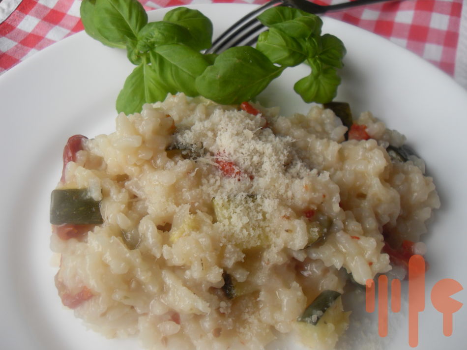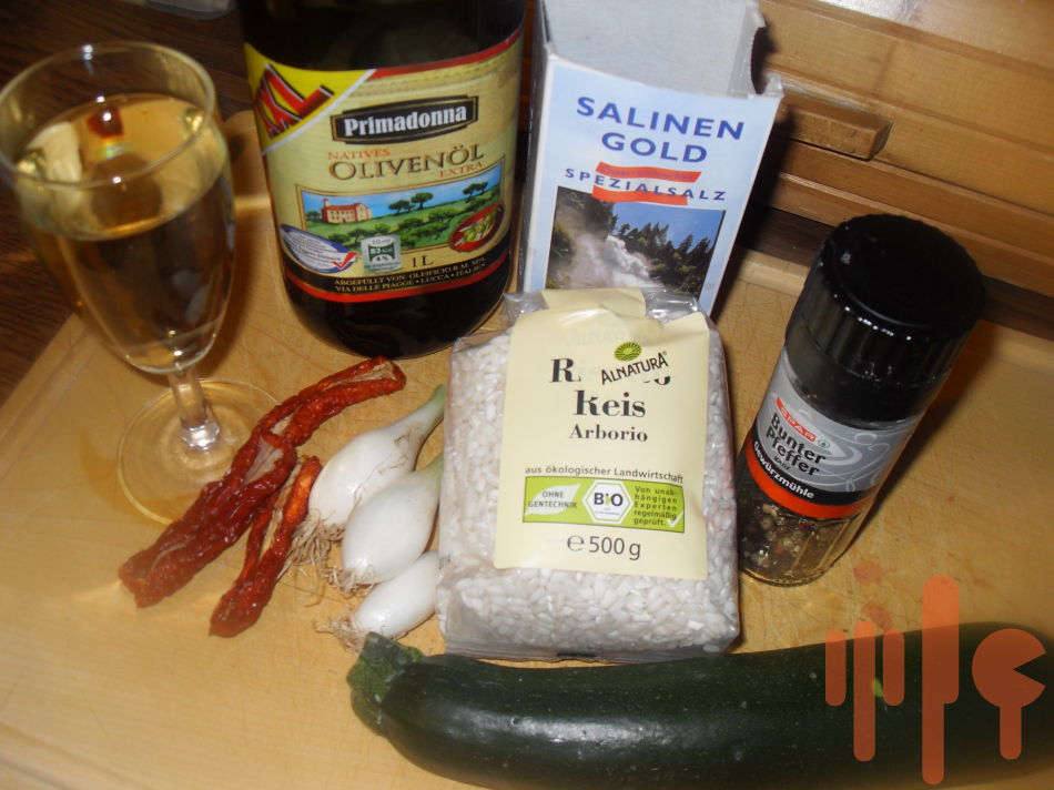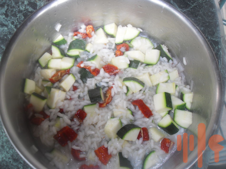 Na oleji speníte na drobno nakrájanú cibuľku, pridáte ryžu a pár minút opražíte. Podlejte ryžu bielym suchým vínom a nechajte ho odpariť. Osoľte a ďalej podlievajte vodou / ja dávam teplú/ v malých množstvách a priebežne miešajte, vždy po odparení tekutiny doplňte ďalšiu a neprestávajte miešať. Keď je ryža polomäkká pridáte k nej na kúsky nakrájanú cuketu a aj sušené paradajky. Ďalej podlievajte a miešajte. Zmes musí byť krémovitej konzistencie. Na záver vmiešajte strúhaný kvalitný parmezán.