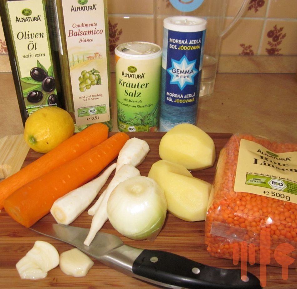 Pridáme vodu a suchú červenú šošovicu, ktorú sme prepláchli pod studenou vodou. Pridáme bobkový list, jeden vytlačený citróna podľa chuti doplníme Balsamico bielym octom. Občas pomiešame, aby sa nám prívarok nepripálil.