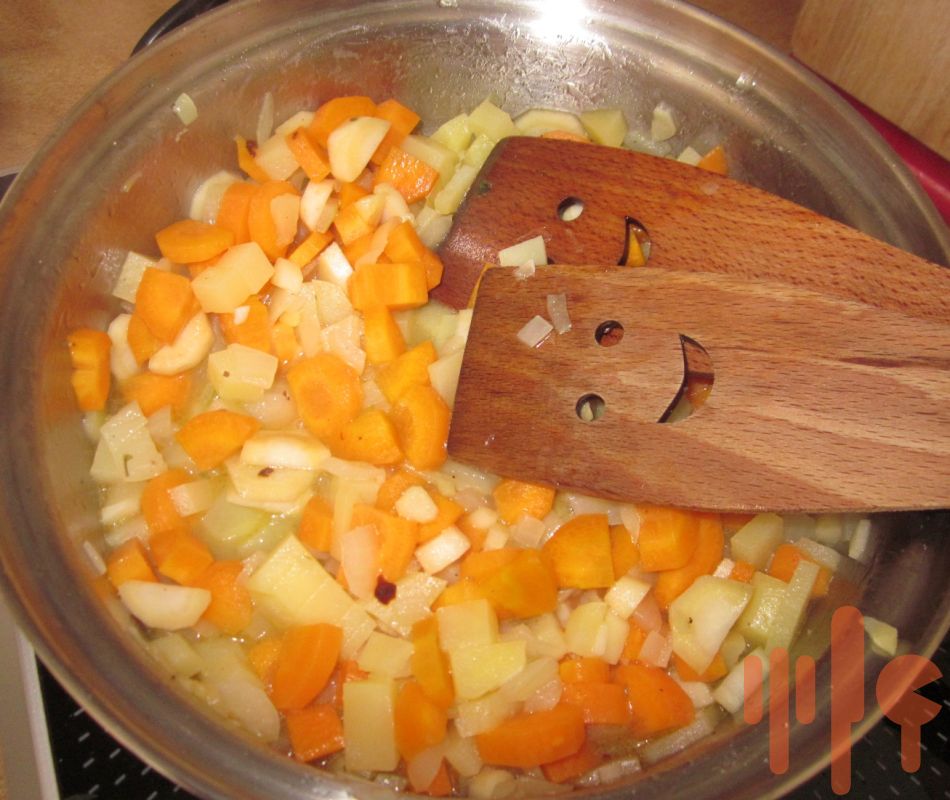 Po chvíli pridáme zeleninu so zemiaky, ochutíme soľou, čienych korením a podľa chuti prípadne aj chilli. Podlejeme vodou a dusíme asi 10-15 minút.
