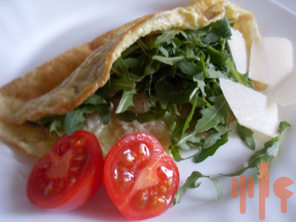 a upečte omeletu. Posypte ju strúhaným parmezánom, rukolou a preložte na polovicu. podávajte s paradajkou.