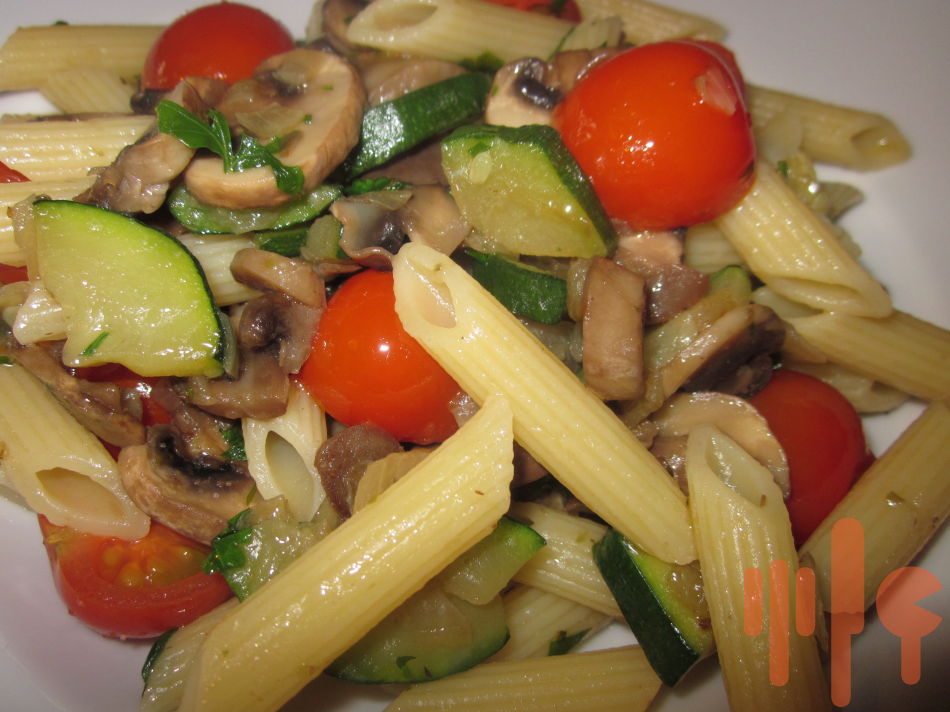 Na olej speňte na drobno nakrájanú cibuľku, pridajte na kolieska nakrájanú neošúpanú cuketu a spolu pár minút restujte bez podlievania tekutinou. Šampiňóny očistite a nakrájajte na plátky, pridajte ich do panvice s cuketou, restujte na miernom ohni a pridajte soľ. Keď je zmes polomäkká pridajte cherry paradajky nakrájané na polovičky, oregano resp. bazalku a nechajte prejsť varom. Zakryte. Pred podávaním zmiešajte scedené neprepláchnuté cestoviny so zeleninvou zmesou, posypte čerstvou vňaťou a podávajte.