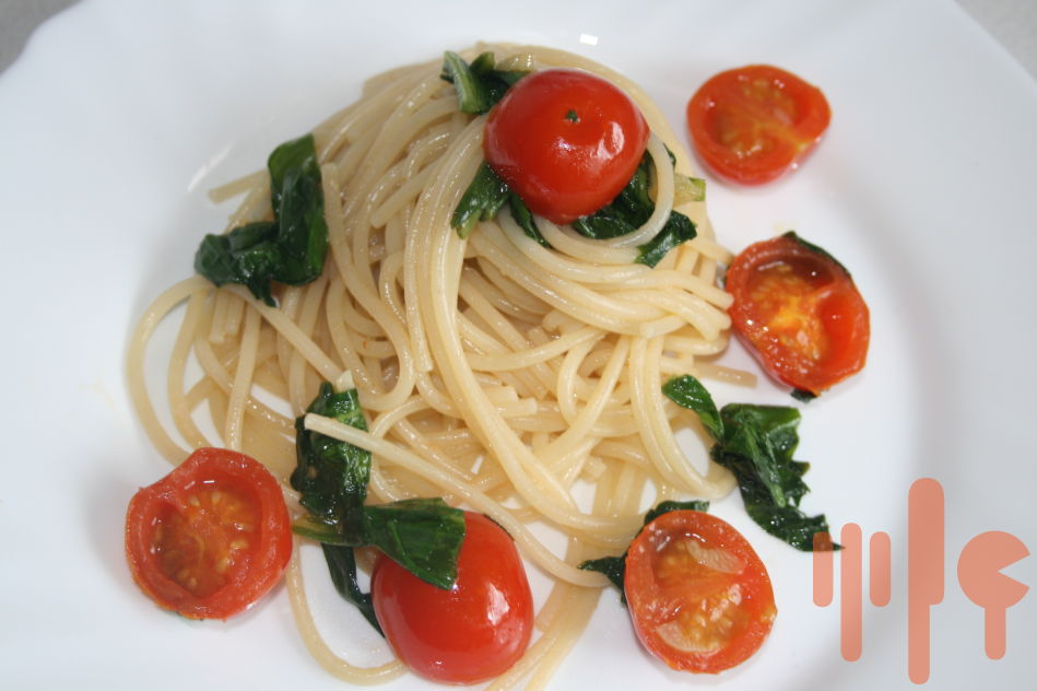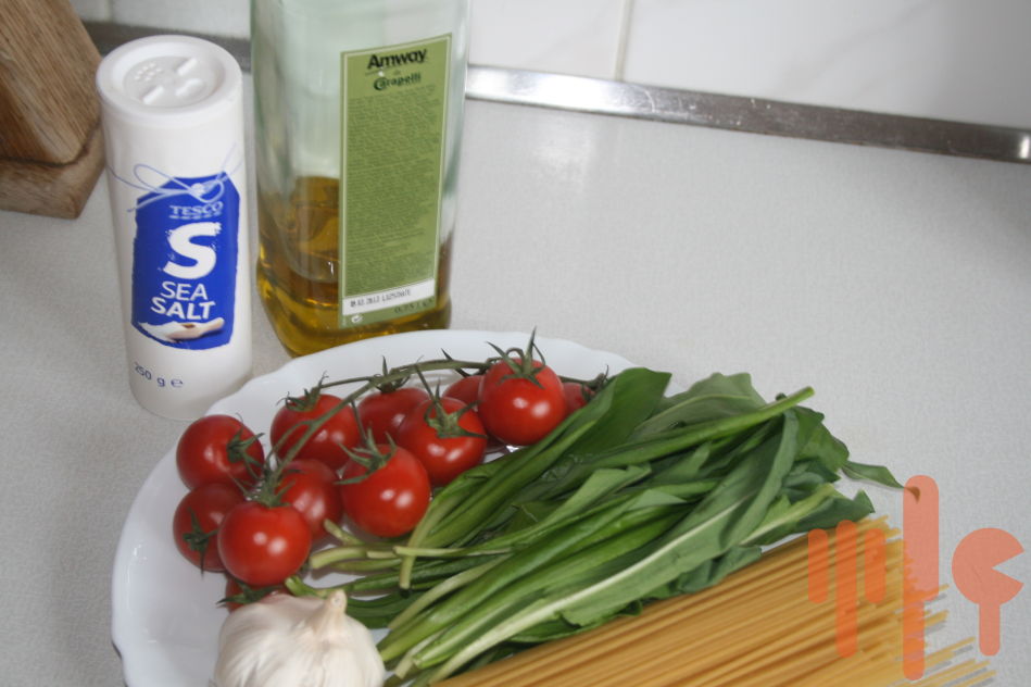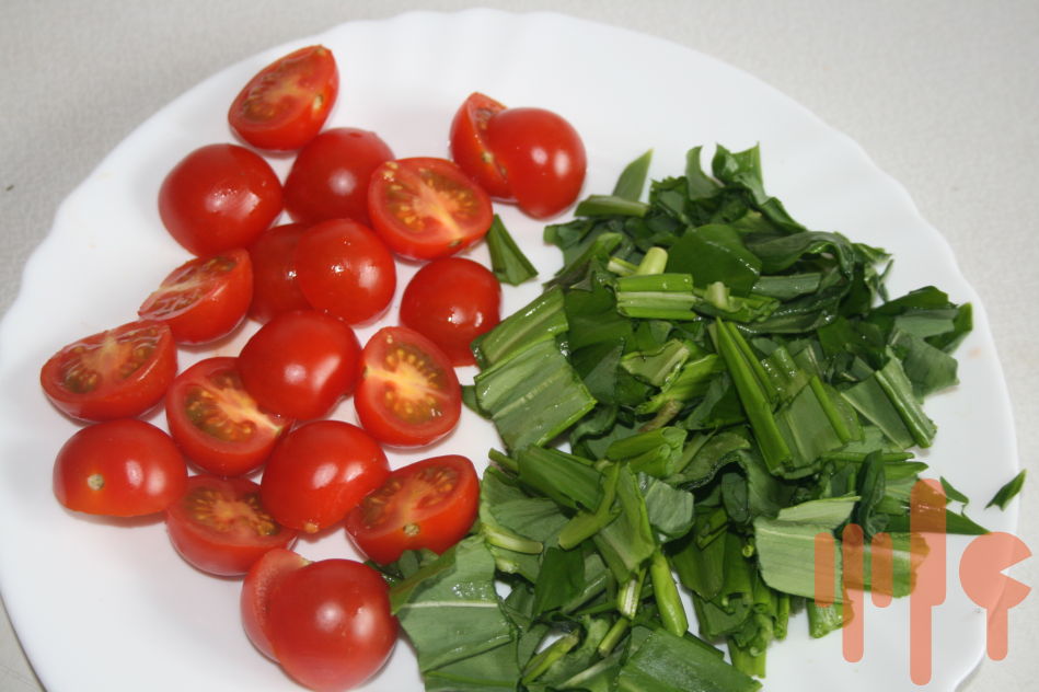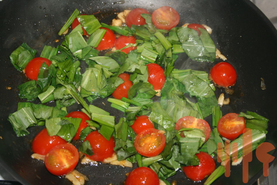Na dobrej panvici zohrejte olej spolu s nakrájaným cesnakom, pridaje rozkrojené cherry paradajky, osoľte a na záver pridajte nakrájaný medvedí cesnak, krátko restujte cca 3-5 minút.
