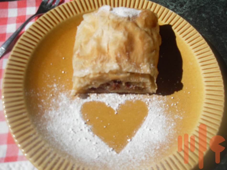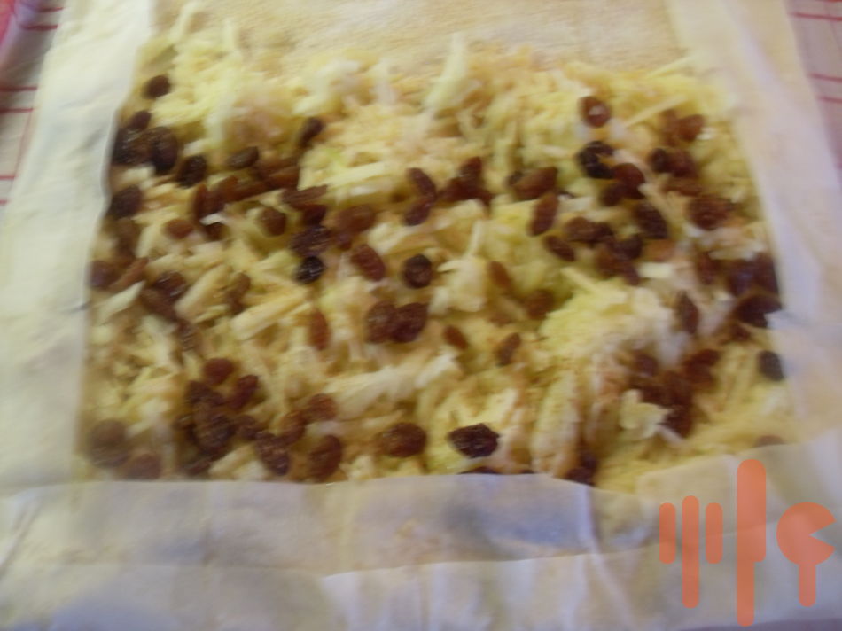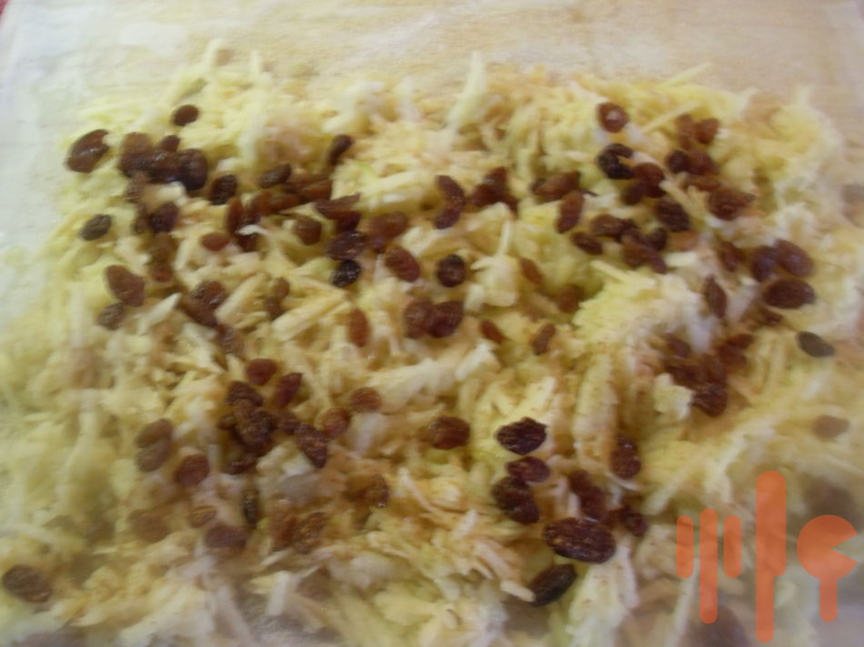 Cesto vyberte z obalu a podľa návodu ho uložte na mierne navlhčenú utierku. Na prvý plát naneste opatrne maslo a priložte druhý plát. Posypte opraženou strúhankou a na dve tretiny rozdeľte jablká, posypte ich hrozienkami, škoricou a vanilkovým cukrom. Náplň nedávajte ku krajom. Okraje cesta preložte dovnútra a pomocou utierky zrolujte štrúdľu, tak aby posledná tretina bez plnky obalila celú štrúdľu. Potrite zbytkom masla a pečte pri 180C cca 20-25 minút.