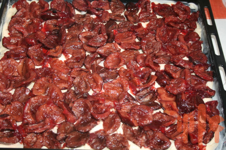Cesto vyvaľkáme na papierom vyložený plech, pokladieme husto slivkami/ môže byť aj iné ovocie/posypeme posekanými orechami a škoricou.