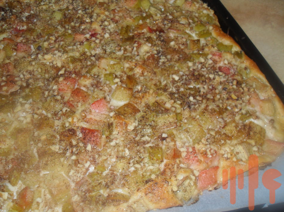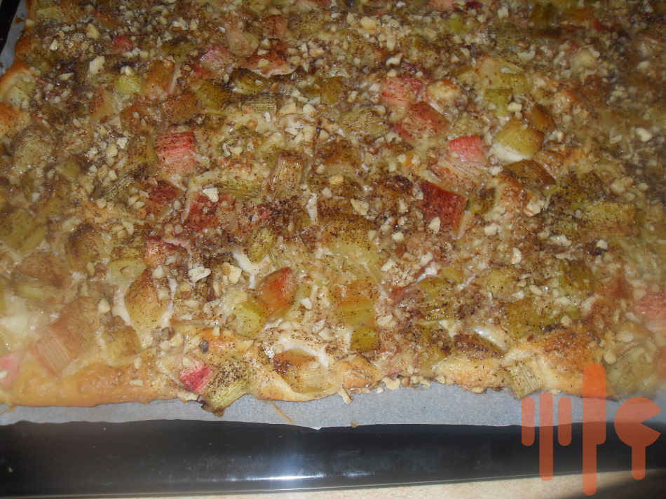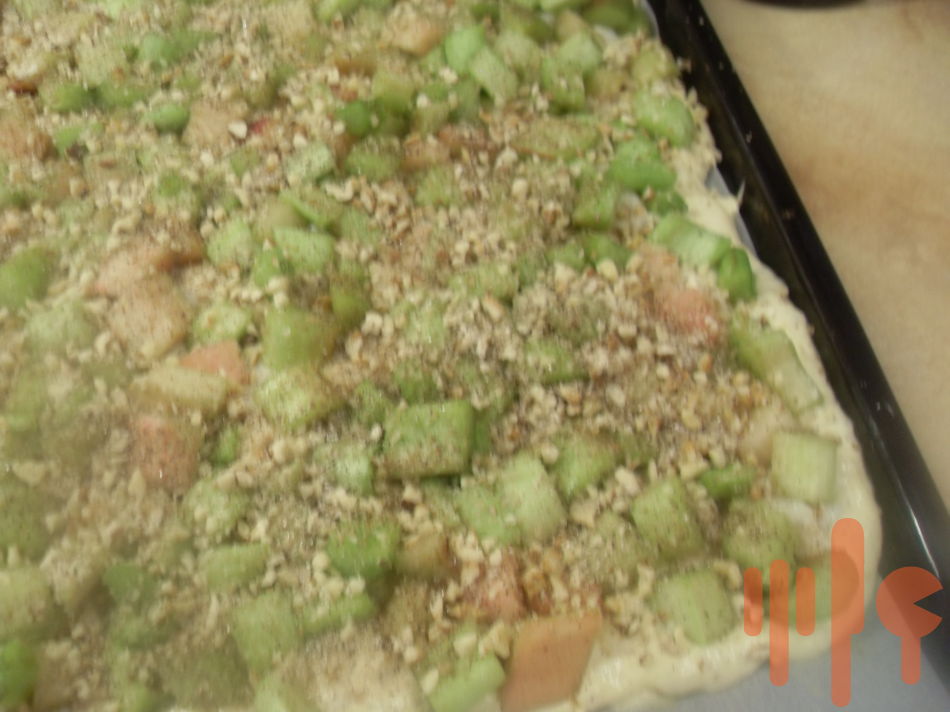 Vykysnuté cesto vytiahneme na plech pokrytý pečiacim papierom / ušetríme na tuku/, na vrch opatrne nanesieme uvarený vychladený puding. Na vrstvu pudingu pokladieme rebarboru / bez šťavy, ktorú pustila z cukru. Na záver posypeme vanilkovým cukrom a sekanými orechmi.