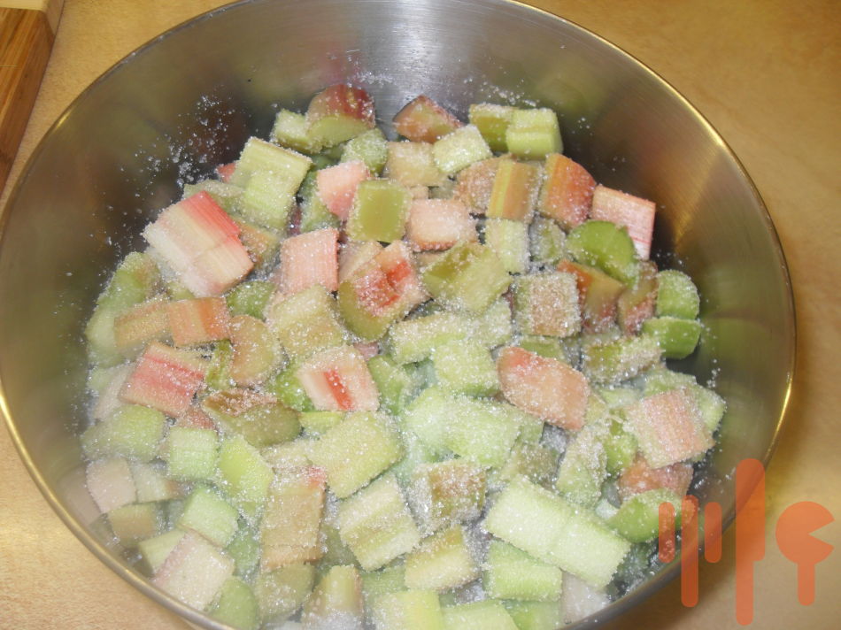 Rebarboru očistíme, nakrájame na kúsky cca 1cm, v nádobe ju zasypeme kryštálovým cukrom a necháme odstáť.