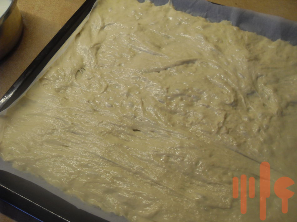Z múky, žĺtka, droždia, 50 gr cukru, jogurtu a cca 100ml mlieka vypracujeme redšie cesto, ktoré necháme nakysnúť pol hodinu.
