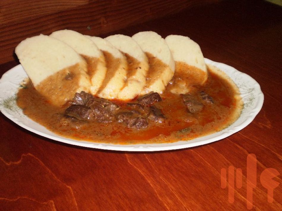 Cibuľu ošúpeme a na doske na krájanie pokrájame na drobné kocky. Odložíme na tanierik. .Do hrnca / cca 2 litrového/ dáme olej a hrniec položíme na platňu sporáku, zapneme a keď je olej rozohriaty vložíme do hrnca vopred pripravené na kocky pokrájané mäso a prudko ho opečieme zo všetkých strán / miešame vareškou, aby sa nepripálilo/, takto opečené kúsky mäsa vyberieme do misky a odložíme. Do hrnca, kde sme opekali mäso pridáme pripravenú nakrájanú cibuľu a za stáleho miešania restujeme do sklovita, hrniec odložíme zo sporáku a vložíme k cibuľovému základu opečené kocky mäsa a primiešame mletú papriku, Vrátime hrniec na platňu sporáku a podlejeme cca 1,5 dl vody. Pridáme čajovú lyžičku soli a prikryté dusíme na miernom ohni do polomäkka. Kým sa dusí mäso očistíme si umytú papriku ,tak, že ju rozkrojíme na polovice vyčistíme ju a pokrájame na pracovnej doske na tenké pásiky. V malom hrnci si na sporáku uvaríme vodu, paradajky umyjeme, ostrým nožíkom ich do kríža jemne narežeme/ len šupku/, a vložíme ich do vriacej vody – nevaríme – hrniec odstavíme zo sporáku a po jednej minúte paradajky vyberieme a ošúpeme. Ošúpane paradajky na doske na krájanie pokrájame na plátky, takto pripravenú zeleninu Pridáme k polomäkkému mäsu a dusíme kým mäso nie je mäkké. Ak je treba podlievame vodou,podľa toho koľko šťavy chceme mať. Na zahustenie použijeme hladkú múku. Dochutíme majoránom, čiernym korením.