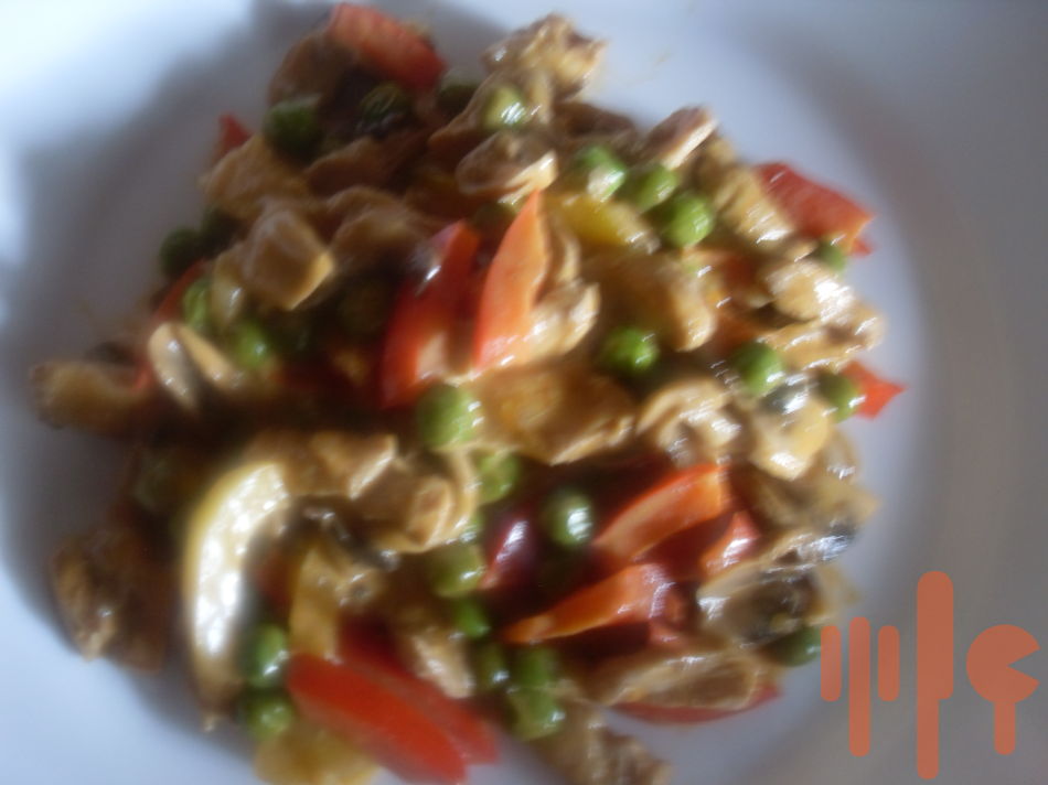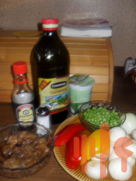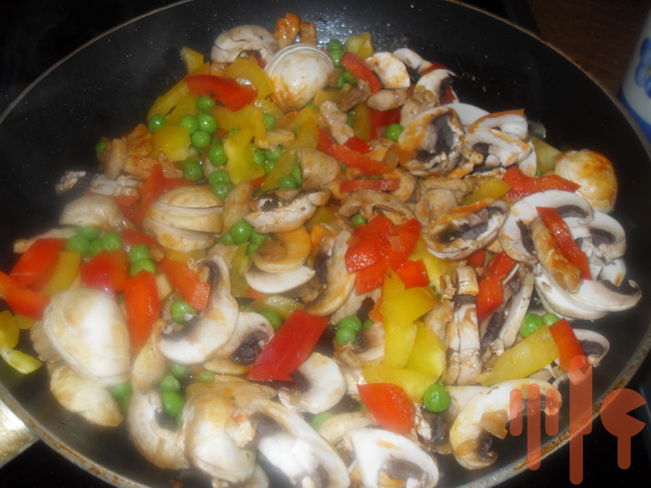 3. na doske na krájanie si nakrájame papriku na rezance, šampiňóny na plátky a všetko spolu s mrazeným hráškom pridáme do panvice s trochou horčice.