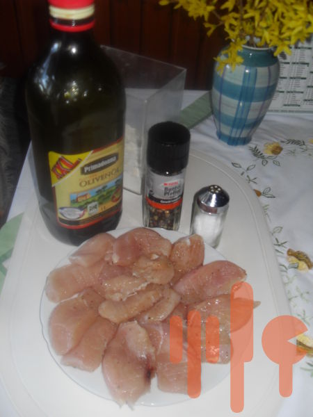 Kuracie prsia bez kože upravíme na rezne / nie je nutné vyklepávať/....osolíme a okoreníme z oboch strán, z jednej strany obalíme múkou a touto stranou vložíme do rozpáleného oleja. Opekáme z každej strany po 3-4 minúty.