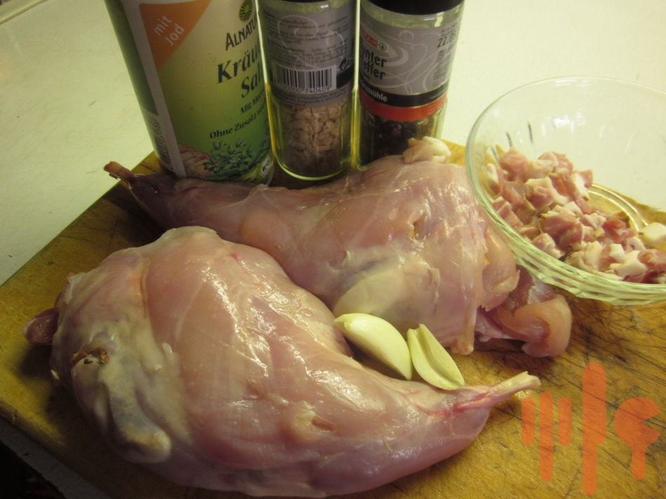 Zadn zajačie stehná prešpikujte slaninou, osoľle, vložte do pekáčika a pridajte nakrájanú šalotku a cesnak. Podlejte trochou vody. Pekáčik vložte do rozohriatej rúry a pečte do mäkka za občasného podlievania vlastným výpekom.