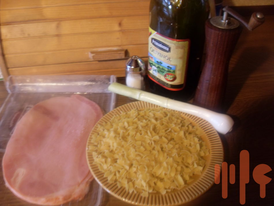 Na oleji speníme nakrájanú jarnú cibuku, pridáme na väčšie štvorčeky nakrájanú šunku,