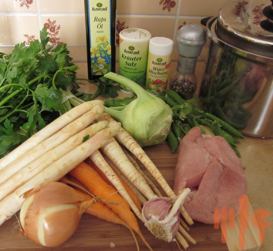 Cibuľu nakrájame na kocky a restujeme na oleji. Pridáme na veľké kocky (2cm) nakrájané morčacie mäso. Zalejeme vodou. Môžete pridať Alnatura zeleninový vývar v kocke, pre zlepšenie a zvýraznenie chuti zeleniny. Soľ, nové a celé čierne korenie. Povarte 15 minút.