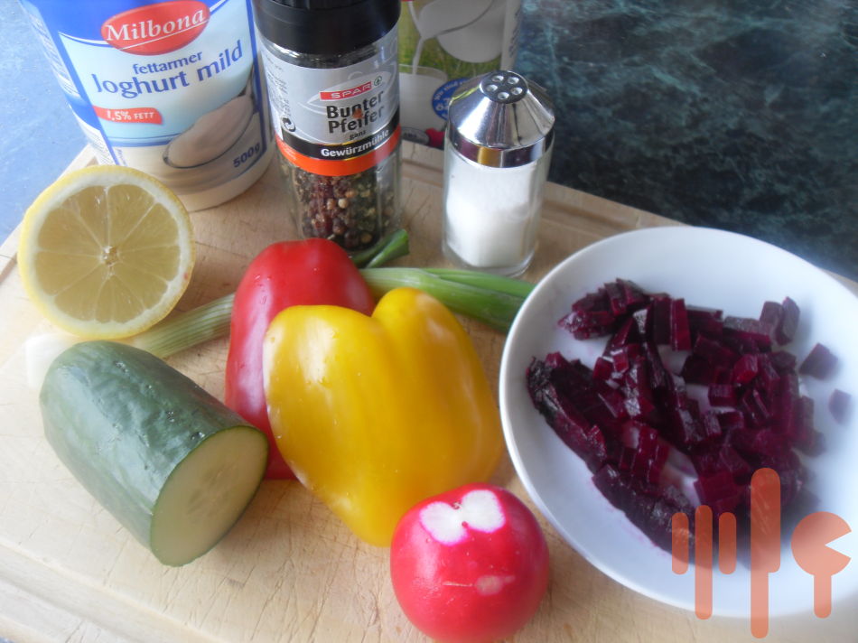 Do jogurtu pridajte soľ, korenie, citrónovú šťavu, olej a mlieko. Zeleninu očistite a nakrájajte na drobné kúsky,