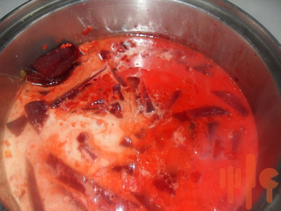 Očistite cibuľu, cesnak a zázvor a všetko nakrájajte na drobno. V hrnci rozohrejte olej, pridajte nakrájanú zmes a orestujte do sklovita. Pridajte cviklu, ktorú ste očistili a nakrájali na kúsky, podlejte vodou a duste do mäkka. Pridajte soľ.