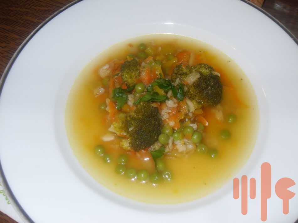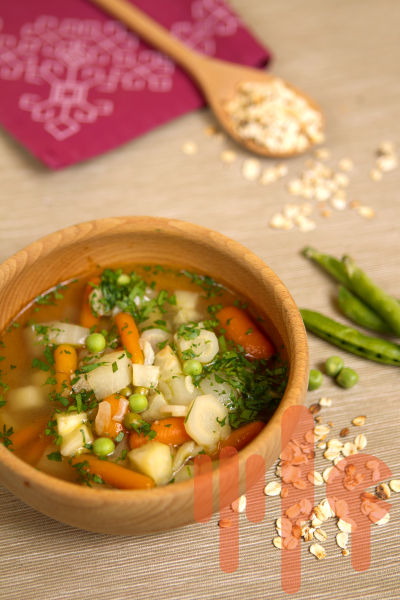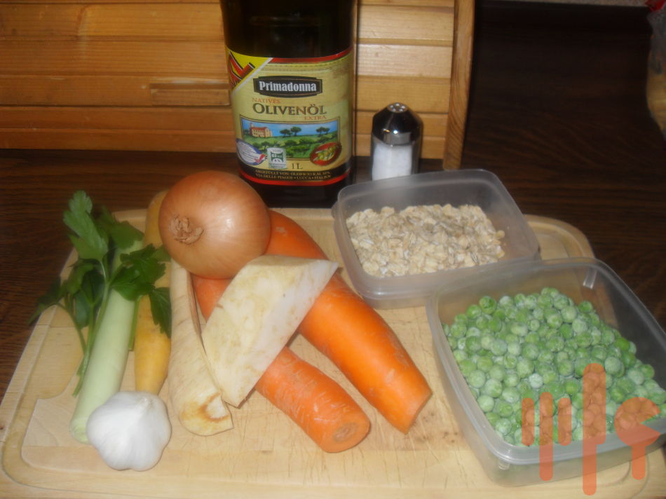 Váha surovín je v očistenom stave. Na oleji osmažíme na drobno nakrájanú cibuľu, cesnak a čerstvý zázvor, pridáme na kolieska nakrájanú mrkvu, chvíľu restujeme, môžeme pridať štipku cukru, pridáme nakrájaný kaleráb a petržlen. Podlejeme vodou a dusíme do polomäkka. Podlejeme vodou a dusíme do polomäkka. Pridáme mrazený hrášok, ochutíme koreninami a varíme do mäkka, nakoniec vsypeme ovsené vločky a polievku vypneme. Ak chcete výraznejšiu chuť, opražte vločky na sucho v panvici do červena.