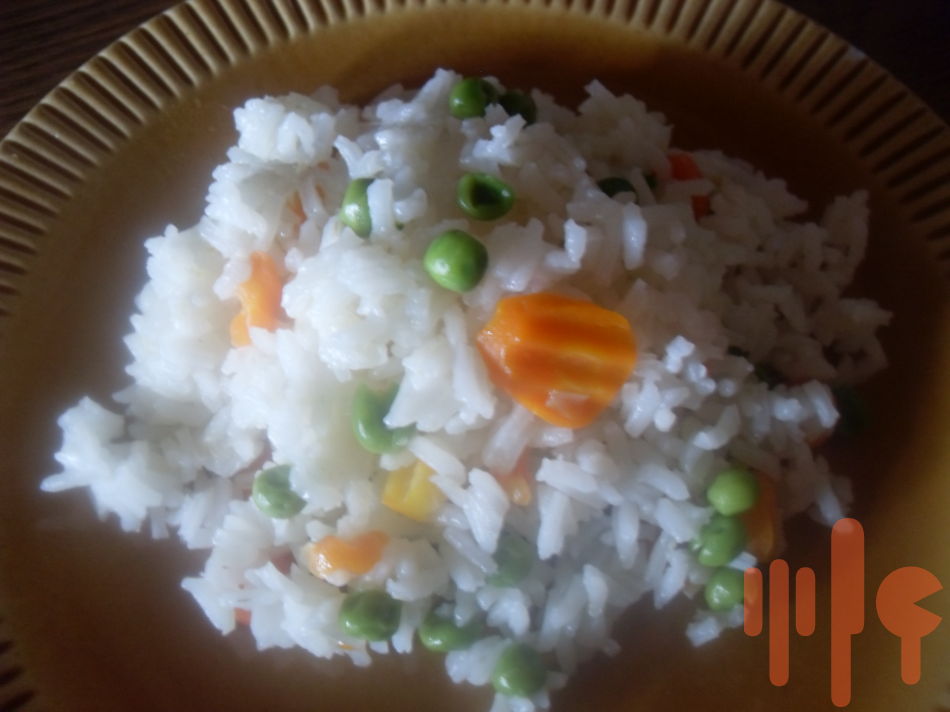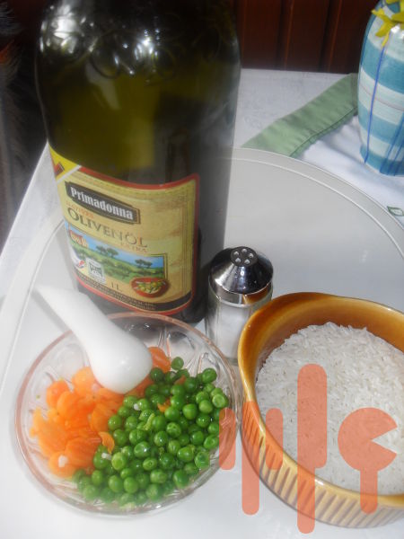 V hrnci speníme cibuľku na oleji, pridáme ryžu, opražíme....pridáme zeleninu a zalejeme horúcou vodou a osolíme.