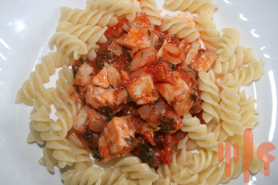 alebo môžeme v panvici zmiešať pripravenú omáčku s rybou spolu s cestovinami.