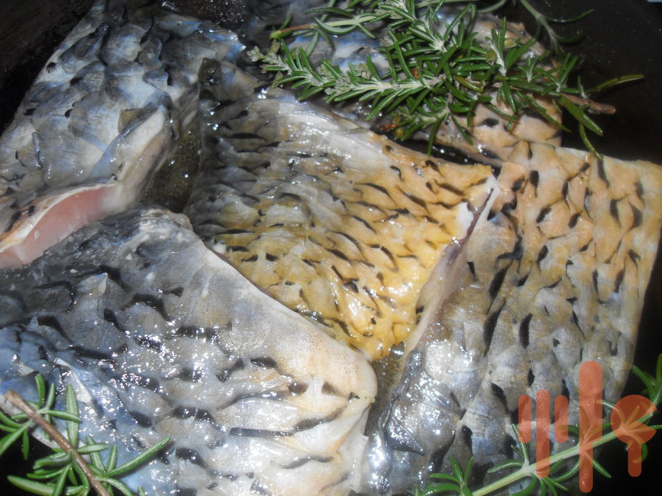 Na zohriaty olej vložíme rozmarín / nespáliť!/ a porcie kapra, opečiem z oboch strán.