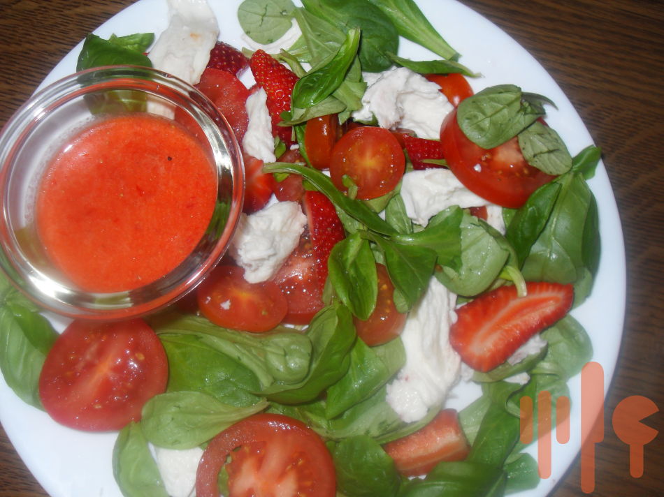 Zálievka: 200g jahôd nakrájajte na kúsky, pridajte citrónovú šťavu, javorový sirup / resp. med/ a rozmixujte ponorným mixérom. Dobre posoľte a okoreňte mletým čiernym korením.