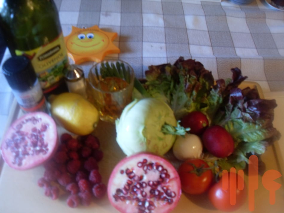 Dubový šalát očistite a natrhajte na väčšie kúsky, jarnú cibuľku spolu s vňatou nakrájajte na väčie kúsky, paradajky nakrájajte na tenké plátky, papriku nakrájajte na tenké pásiky. Reďkovky a mladý kaleráb nakrájajte škrabkou na zeleninu na tenké plátky. Všetku zeleninu opatrne premiešajte v mise, pridajte zrnká z granátového jablka a zachytenú šťavu a ozdobte zvyšnými malinami. Nakoniec pridajte vychladený dresing. Premiešajte a podávajte.